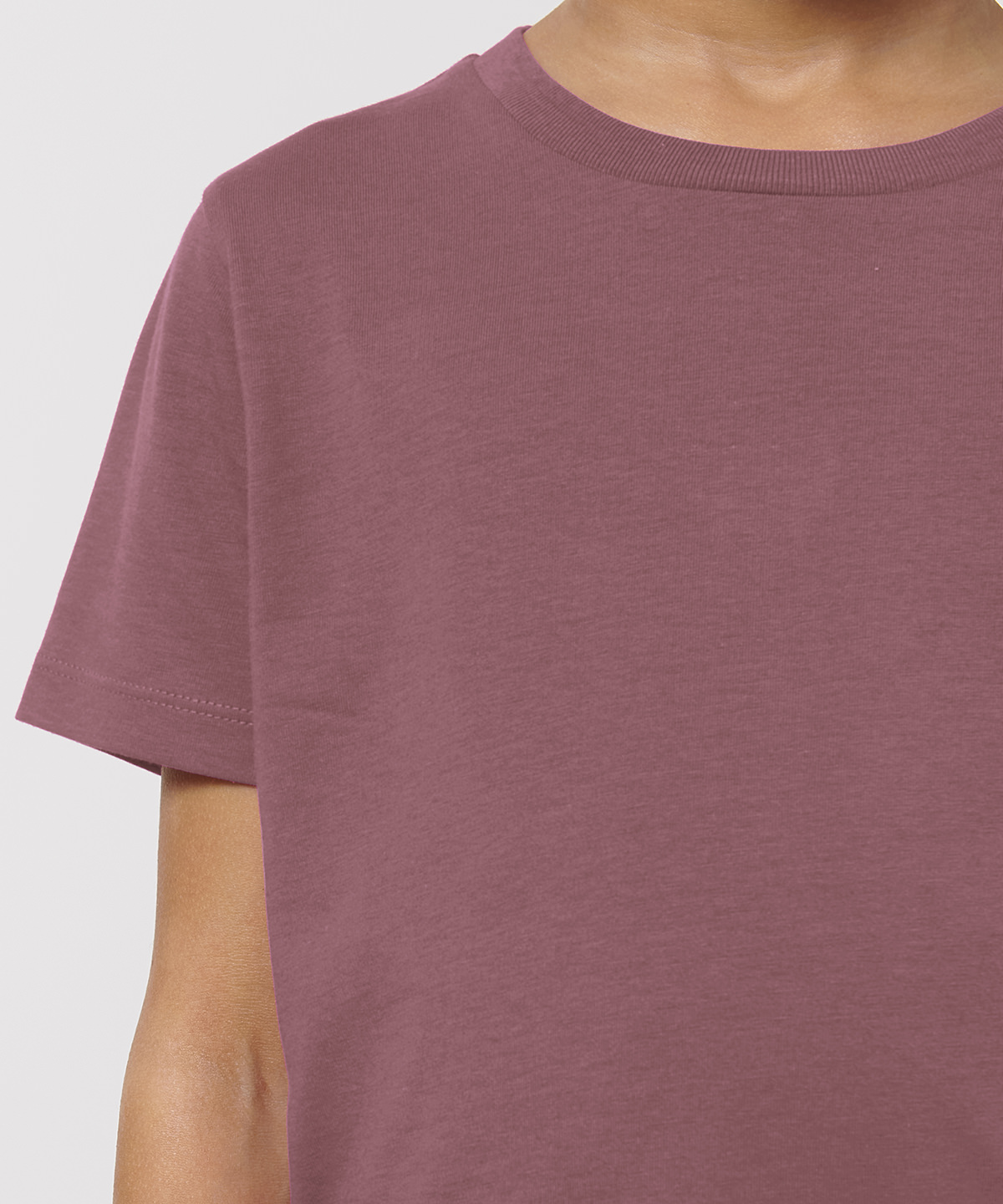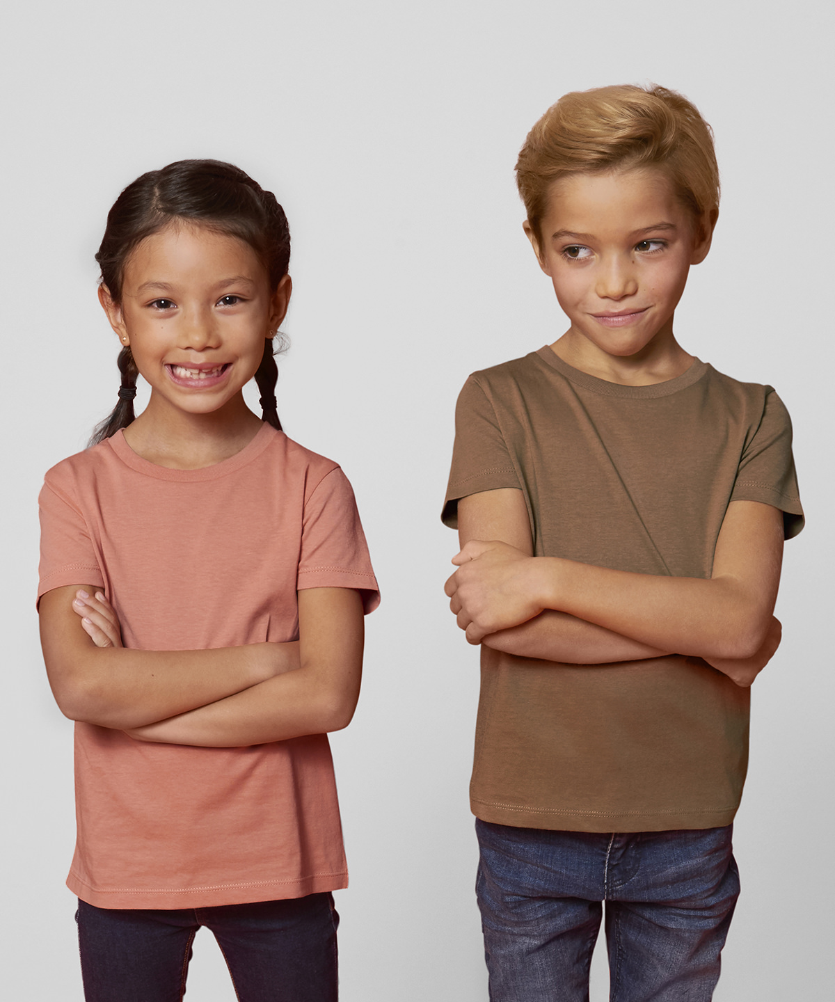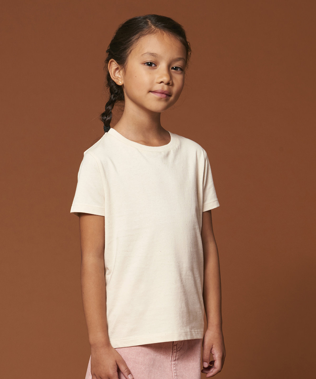Set-in sleeve. 1×1 rib at neck collar. Inside back neck tape in self-fabric. Sleeve hem and bottom hem with narrow double topstitch. Kids, medium fit, short sleeve, round-neck. 100% organic ringspun combed cotton. Single Jersey. Fabric washed.